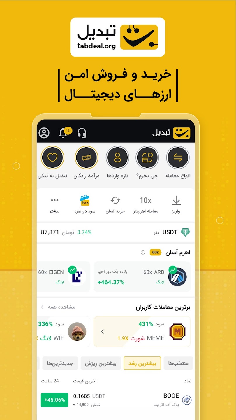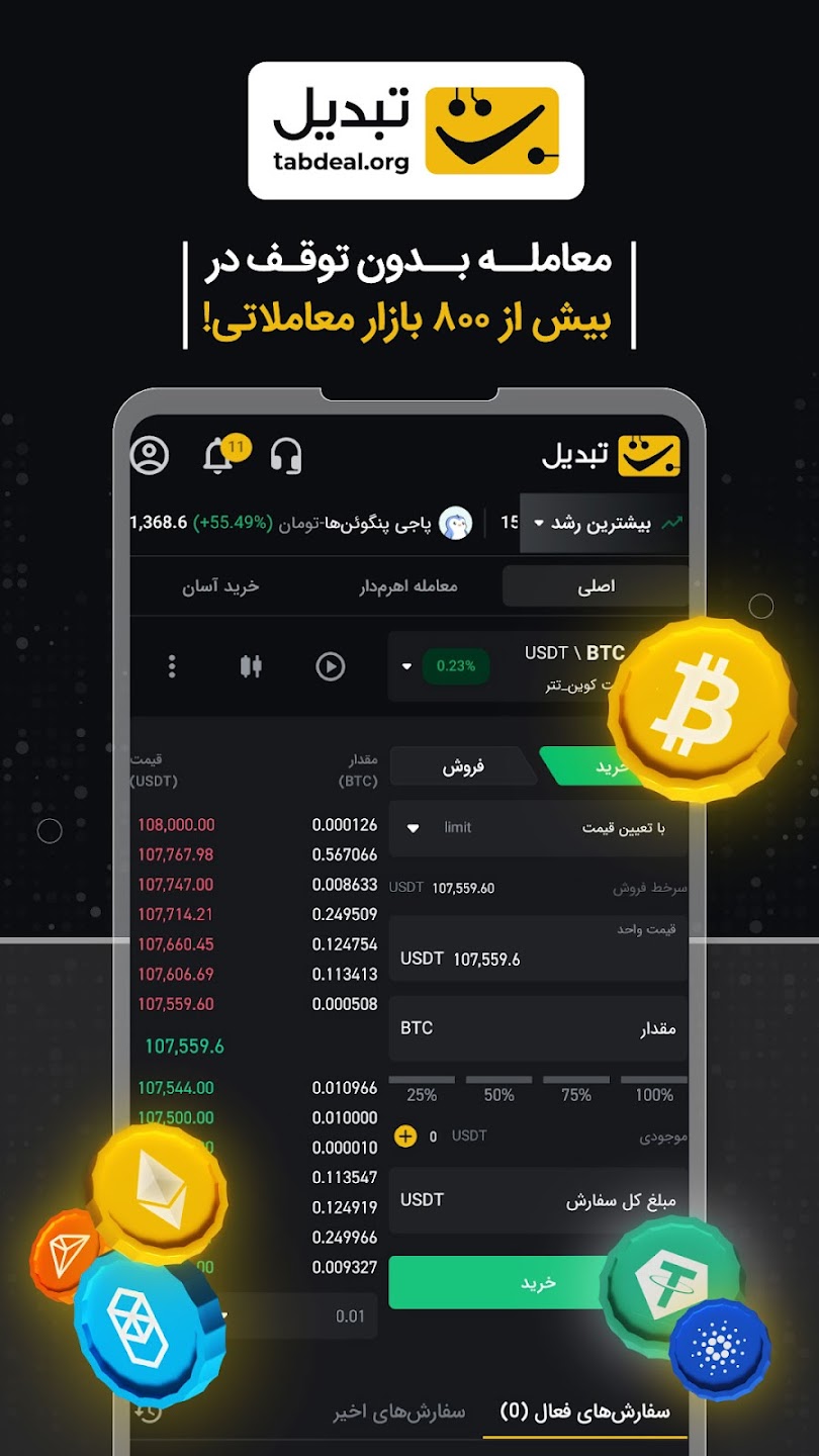 به آسانی به معاملهی رمزارز دلخواه خود بپردازید. تبدیل با ارائه سبد متنوع بیش از ۲۰۰ ارز دیجیتال، متنوعترین بازارها را در بین صرافیهای ایرانی دارد. تبدیل میزبان بیش از ۵۰۰ هزار معاملهگر حرفهای است و عمق بازار آن از ۲۰ میلیارد تومان عبور میکند. تبدیل برای اولین بار در ایران، استفاده از ابزارهای حدضرر و OCO را برای کاربران خود میسر کرد. با احراز هویت ۲۴ ساعتهی تبدیل، شما میتوانید در سریعترین فرصت به معامله بر بستر این صرافی بپردازید.